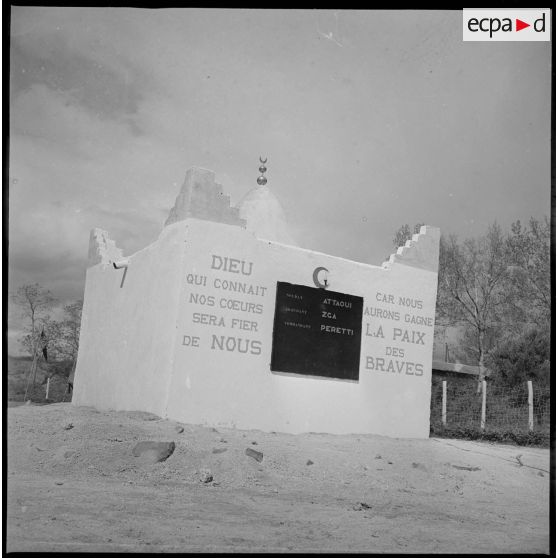 Vue du marabout du commando Georges. On peut y lire la devise suivante : " Dieu qui connaît nos coeurs sera fier de nous, car nous aurons gagné la paix des braves ". [légende d'origine]