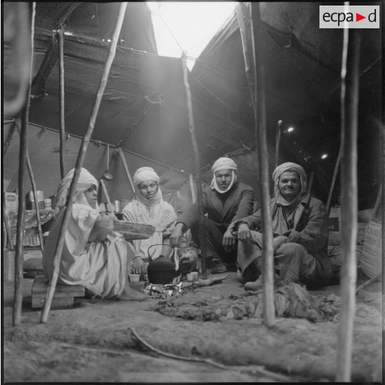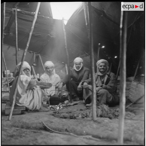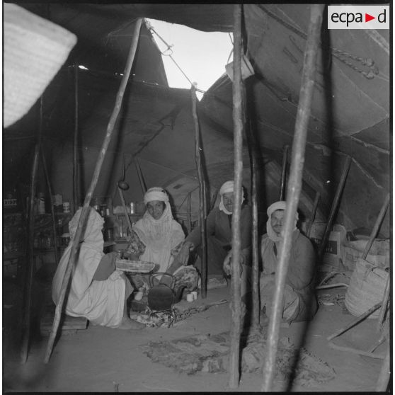 Habitation et vie quotidienne. Une famille pose à l'intérieur d'une khaïma.