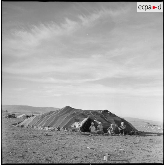 Habitation et vie quotidienne. Une famille pose devant un khaïma (plan éloigné).