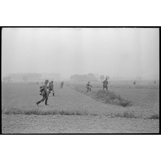 En Belgique, entre Mons et Valenciennes, les fantassins allemands du 469 I.R (Infanterie.Regiment) progressent vers Thulin.