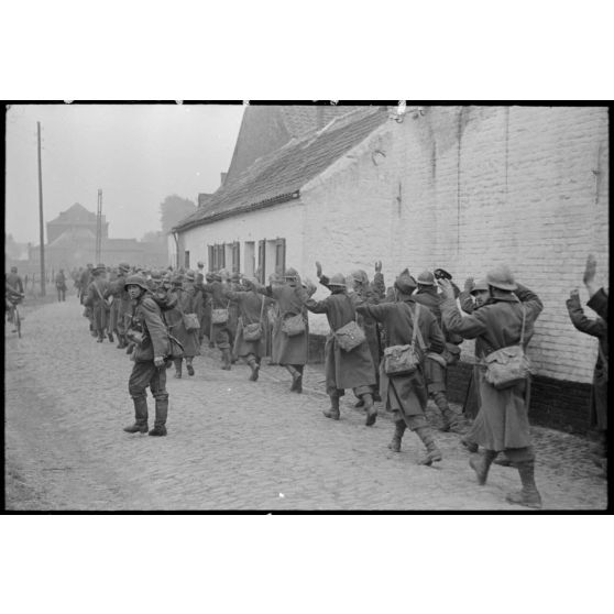 En Belgique, à Thulin, dans la rue Brouta, les dernières troupes françaises cessent le combat et sont escortées sous bonne garde.