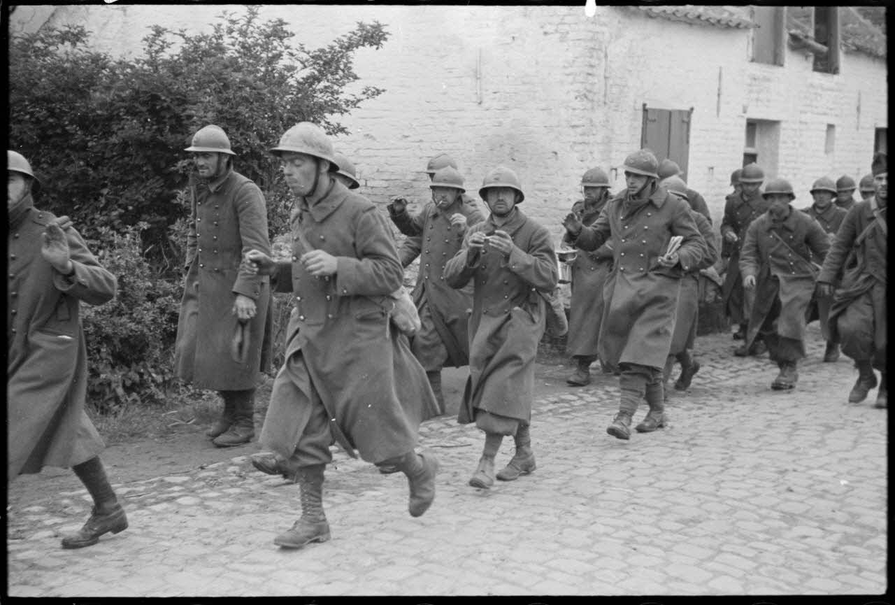 En Belgique, à Thulin, dans la rue Brouta, les dernières troupes françaises cessent le combat et sont escortées sous bonne garde.