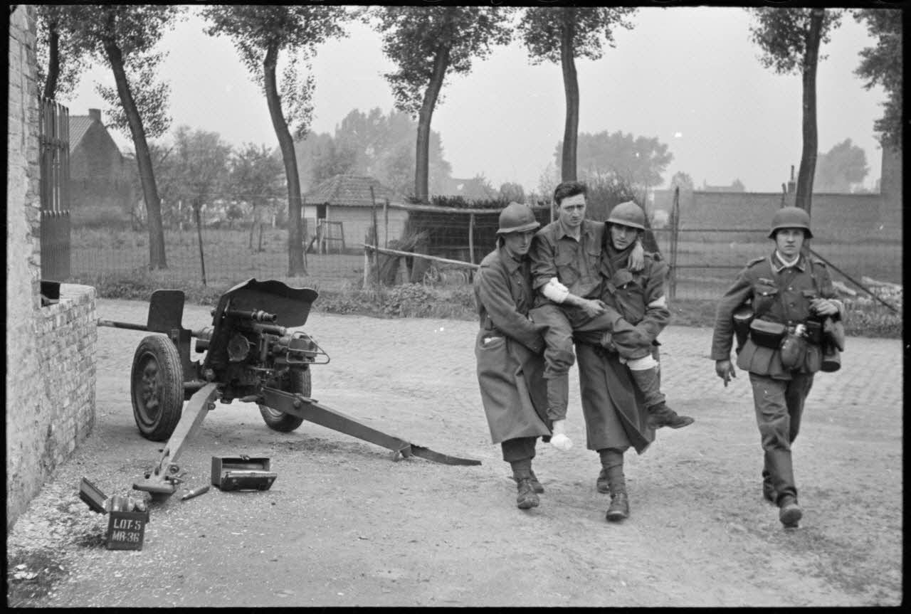 A Thulin, entre les rues du Calvaire et Victor Delporte, des prisonniers français quittent le village, un canon antichar français de 25 mm est encore en position.