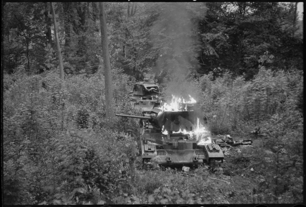 Dans le secteur d'Arras, des blindés britanniques Matilda du 7th Royal Tank Regiment dont l'un brûle encore, sont les témoins de la tentative de contre-attaque sur le flanc allemand de la "Frankforce" de la BEF (British expeditionary force).