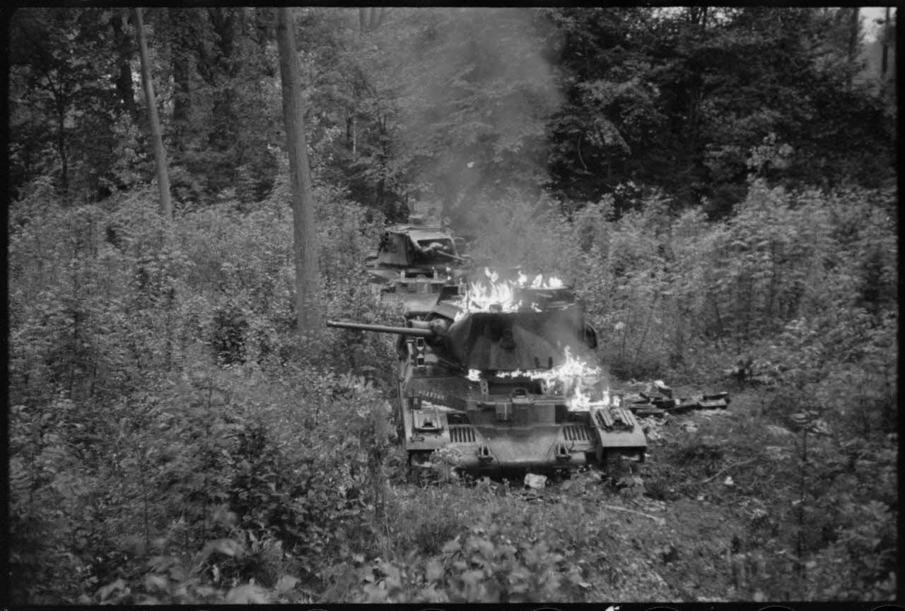 Dans le secteur d'Arras, des blindés britanniques Matilda du 7th Royal Tank Regiment dont l'un brûle encore, sont les témoins de la tentative de contre-attaque sur le flanc allemand de la "Frankforce" de la BEF (British expeditionary force).