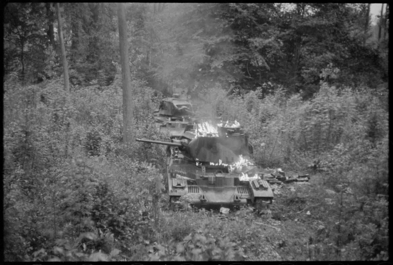 Dans le secteur d'Arras, des blindés britanniques Matilda du 7th Royal Tank Regiment dont l'un brûle encore, sont les témoins de la tentative de contre-attaque sur le flanc allemand de la "Frankforce" de la BEF (British expeditionary force).