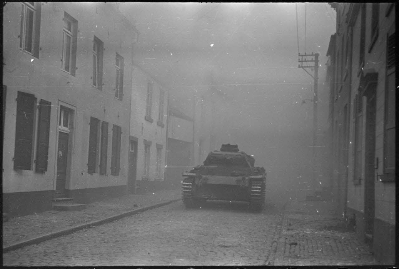 Après la prise de Perwez en Brabant (Belgique), le reporter Eric Borchert immortalise un blindé de la 4e division blindée (4.Panzer-Division).