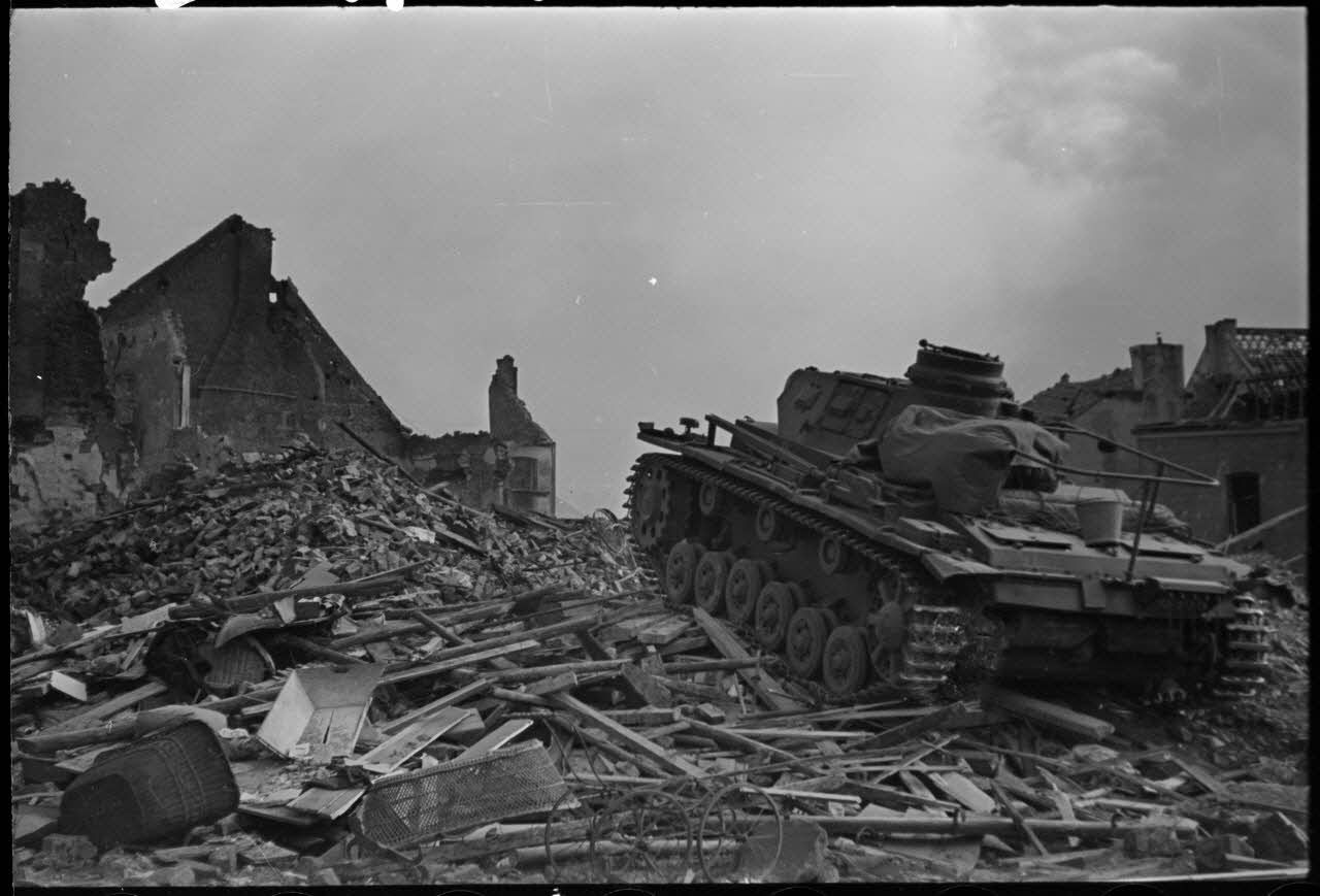 Après la prise de Perwez en Brabant (Belgique), le reporter Eric Borchert immortalise un blindé de la 4e division blindée (4.Panzer-Division).