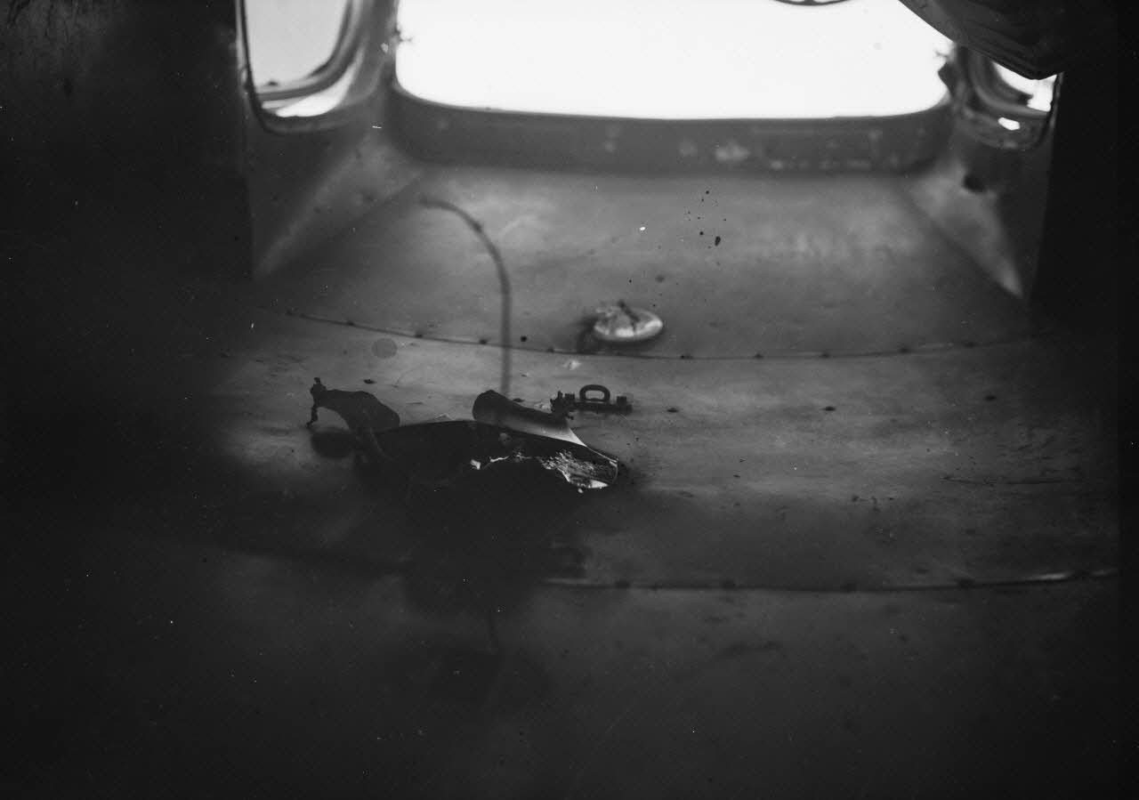 Vues des destructions provoquées par l'attaque Viêt-minh : impacts de balles et roquettes, vitres cassées et moteur détruit.