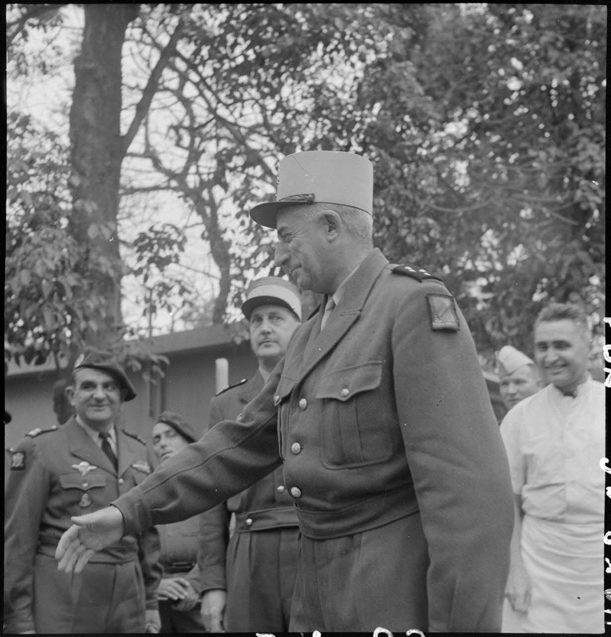 Le général de Linarès serre la main d'un sergent-chef du 1er bataillon du 5e REI (régiment étranger d'infanterie) à l'hôpital Lanessan à Hanoï.