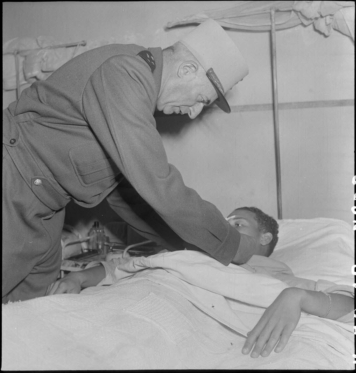 Le général de Linarès au-dessus du lit d'un soldat alité à l'hôpital Lanessan à Hanoï.