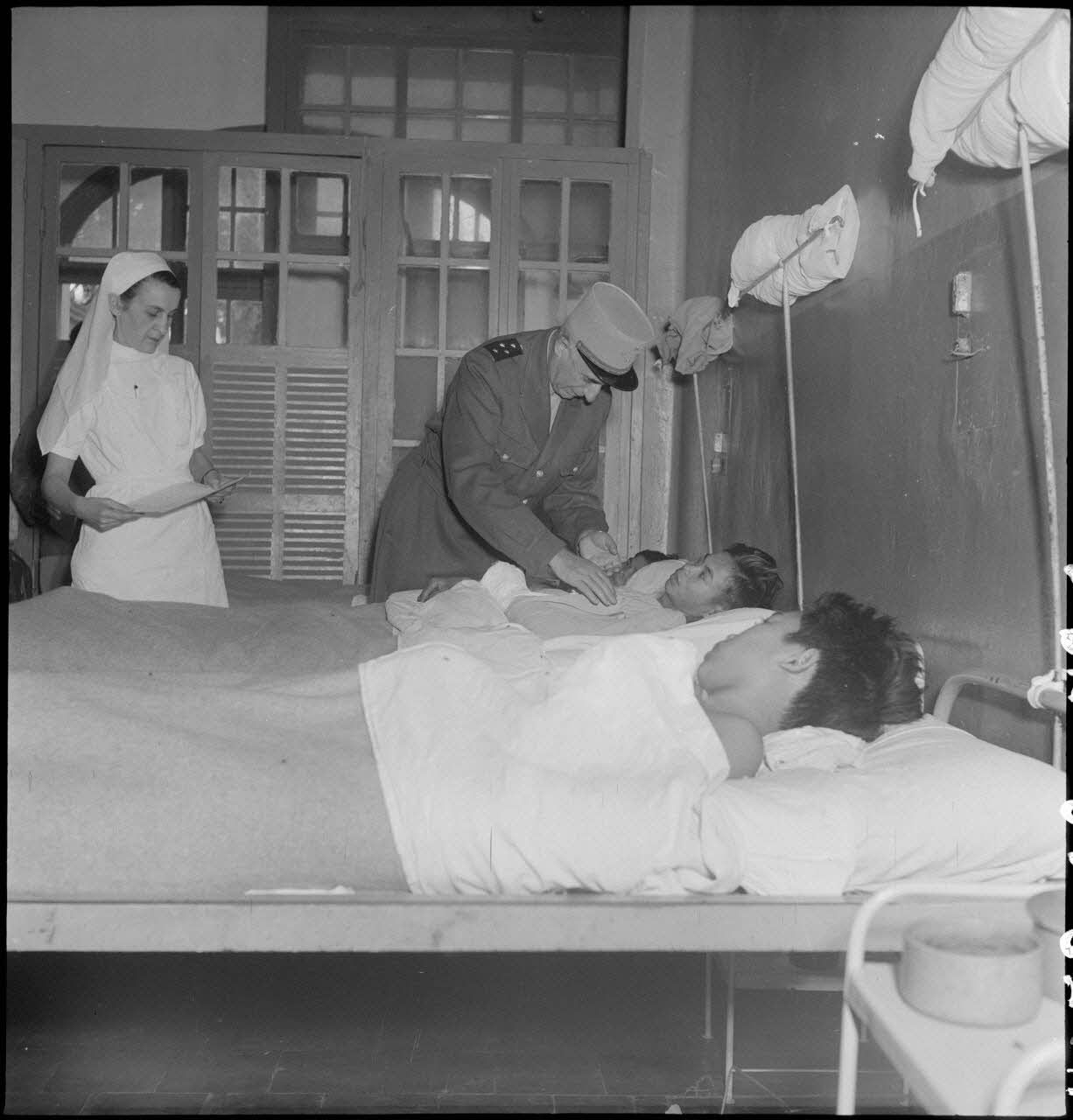 Le général de Linarès au dessus du lit de soldats vietnamiens à l'hôpital Lanessan à Hanoï.