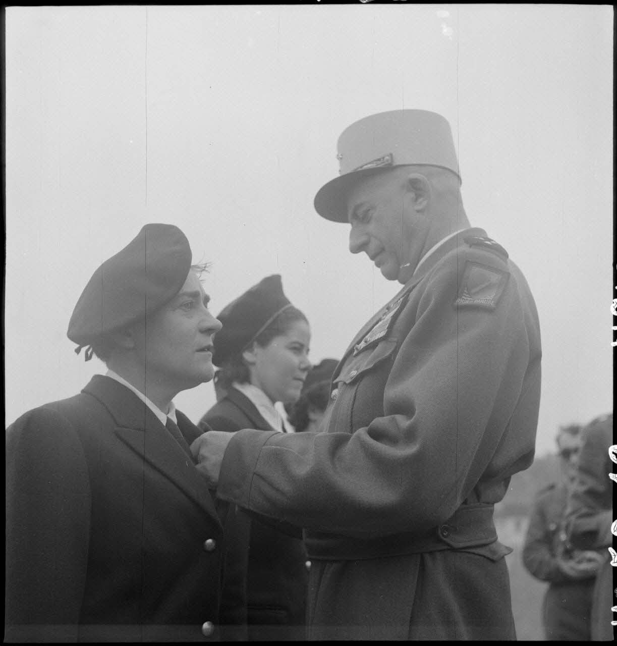 Le général de Linarès décore une femme-soldat, chef de détachement PFAT-Tonkin, lors de la prise d'armes du PFAT(personnel féminin de l'armée de Terre) au stade Mangin.