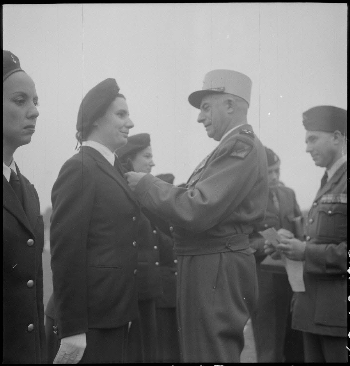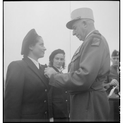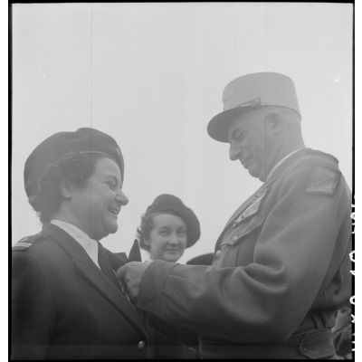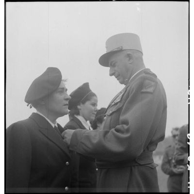 Le général de Linarès décore une femme-soldat, chef de détachement PFAT-Tonkin, lors de la prise d'armes du PFAT(personnel féminin de l'armée de Terre) au stade Mangin.