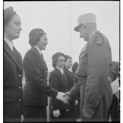 Le général de Linarès et un personnel féminin lors de la prise d'armes du PFAT (personnel féminin de l'armée de Terre) au stade Mangin.