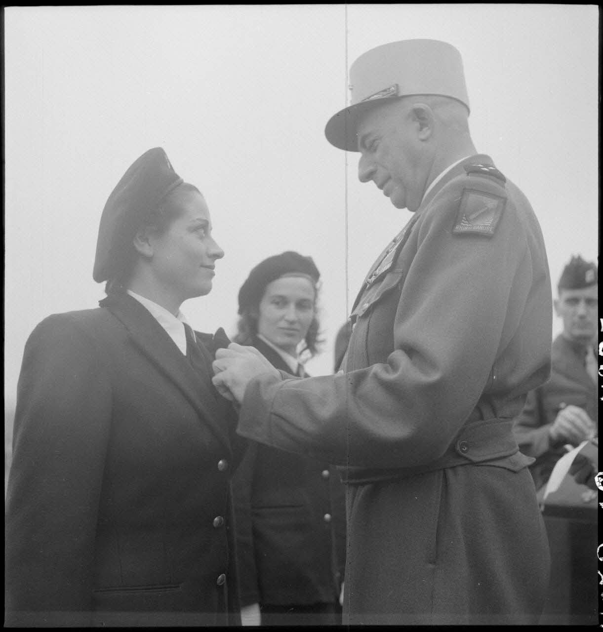 Le général de Linarès décore une femme-soldat, chef de détachement PFAT-Tonkin, lors de la prise d'armes du PFAT(personnel féminin de l'armée de Terre) au stade Mangin.