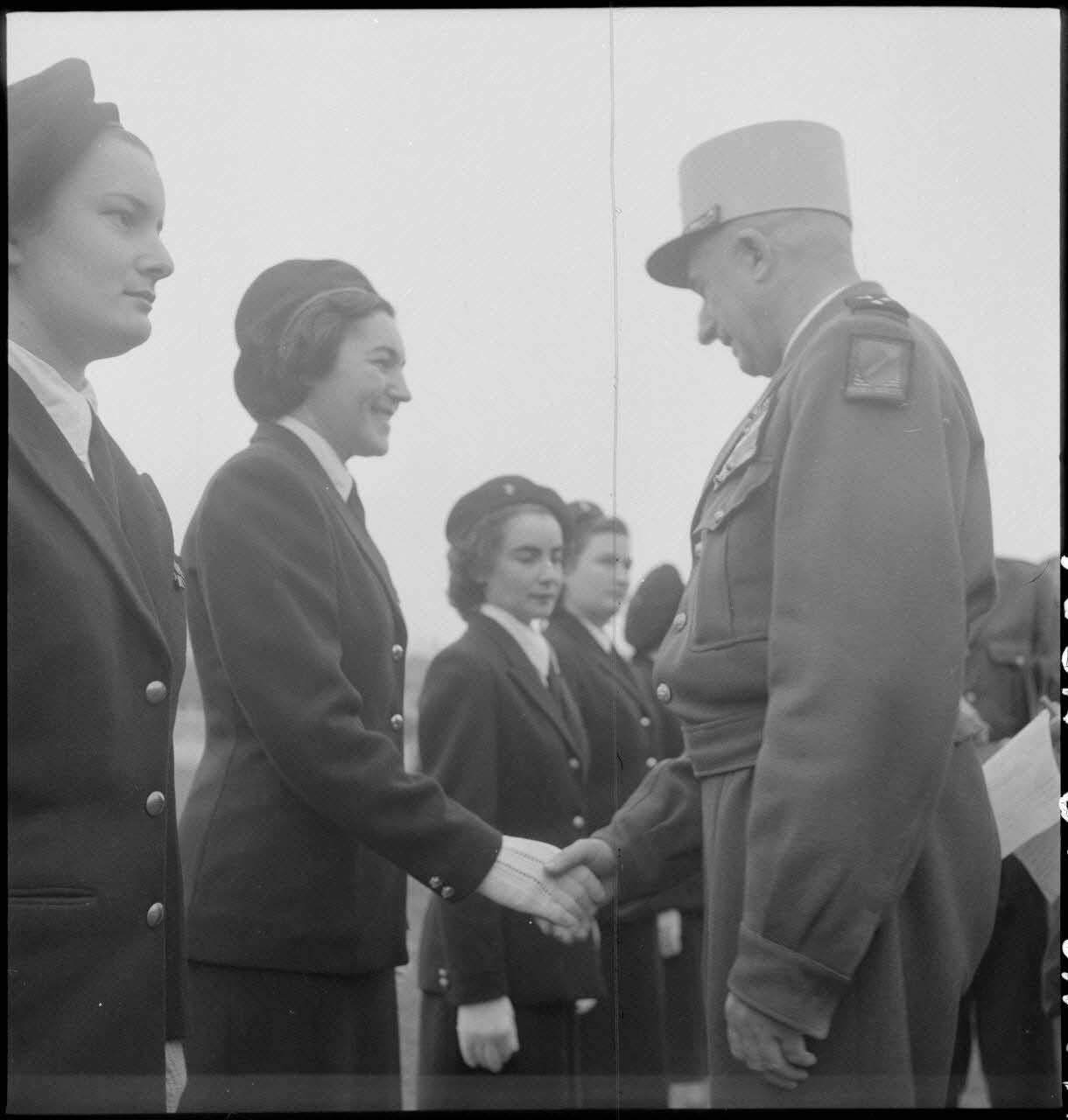 Le général de Linarès décore une femme-soldat, chef de détachement PFAT-Tonkin, lors de la prise d'armes du PFAT(personnel féminin de l'armée de Terre) au stade Mangin.