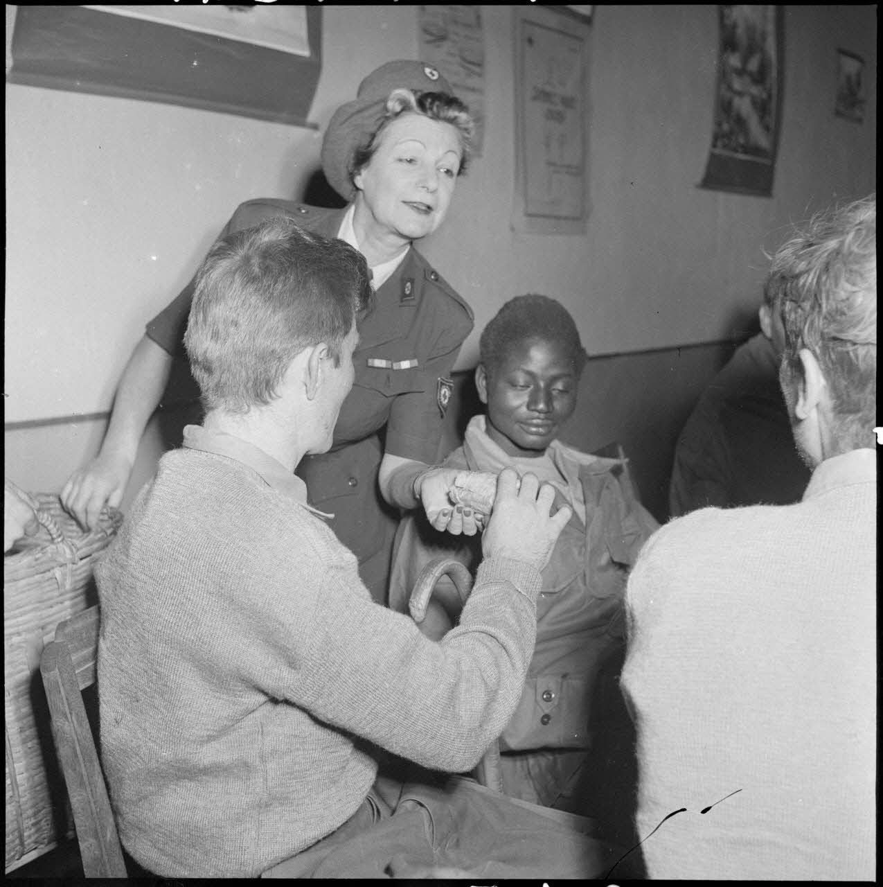 Une discussion entre des hommes du CEFEO (Corps expéditionnaire français en Extrême-Orient), récemment libérés, et une femme de la Croix-Rouge.