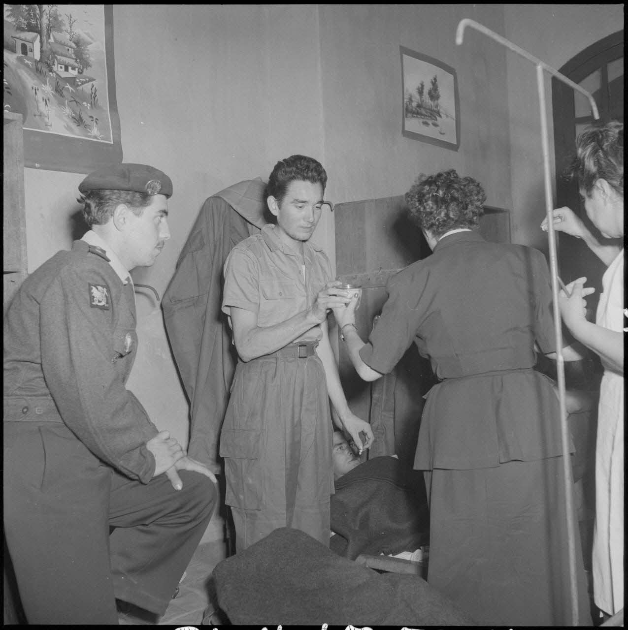 Une discussion entre des hommes du CEFEO (Corps expéditionnaire français en Extrême-Orient), récemment libérés, et une femme de la Croix-Rouge.