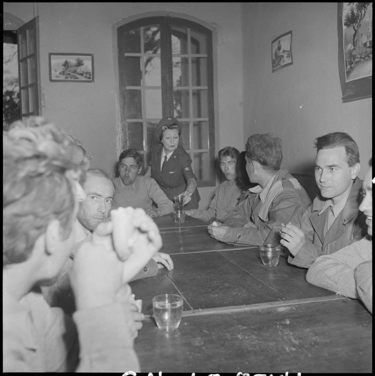 Une discussion entre des hommes du CEFEO (Corps expéditionnaire français en Extrême-Orient), récemment libérés, et une femme de la Croix-Rouge.