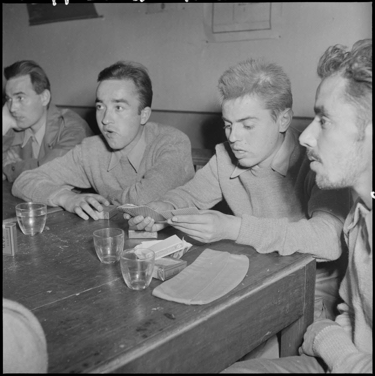 Une discussion entre des hommes du CEFEO (Corps expéditionnaire français en Extrême-Orient), récemment libérés, et une femme de la Croix-Rouge.