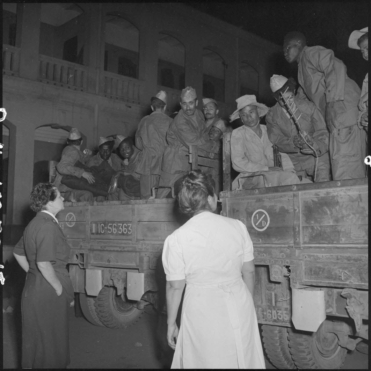 Des hommes du CEFEO (Corps expéditionnaire français en Extrême-Orient), récemment libérés, s'apprêtent à descendre d'un camion.