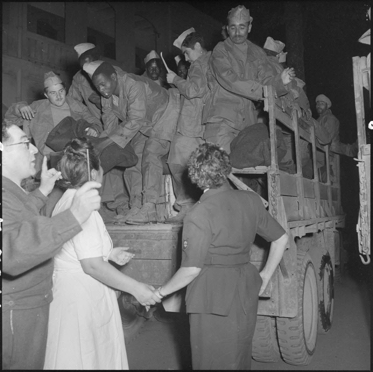 Des hommes du CEFEO (Corps expéditionnaire français en Extrême-Orient), récemment libérés, s'apprêtent à descendre d'un camion.