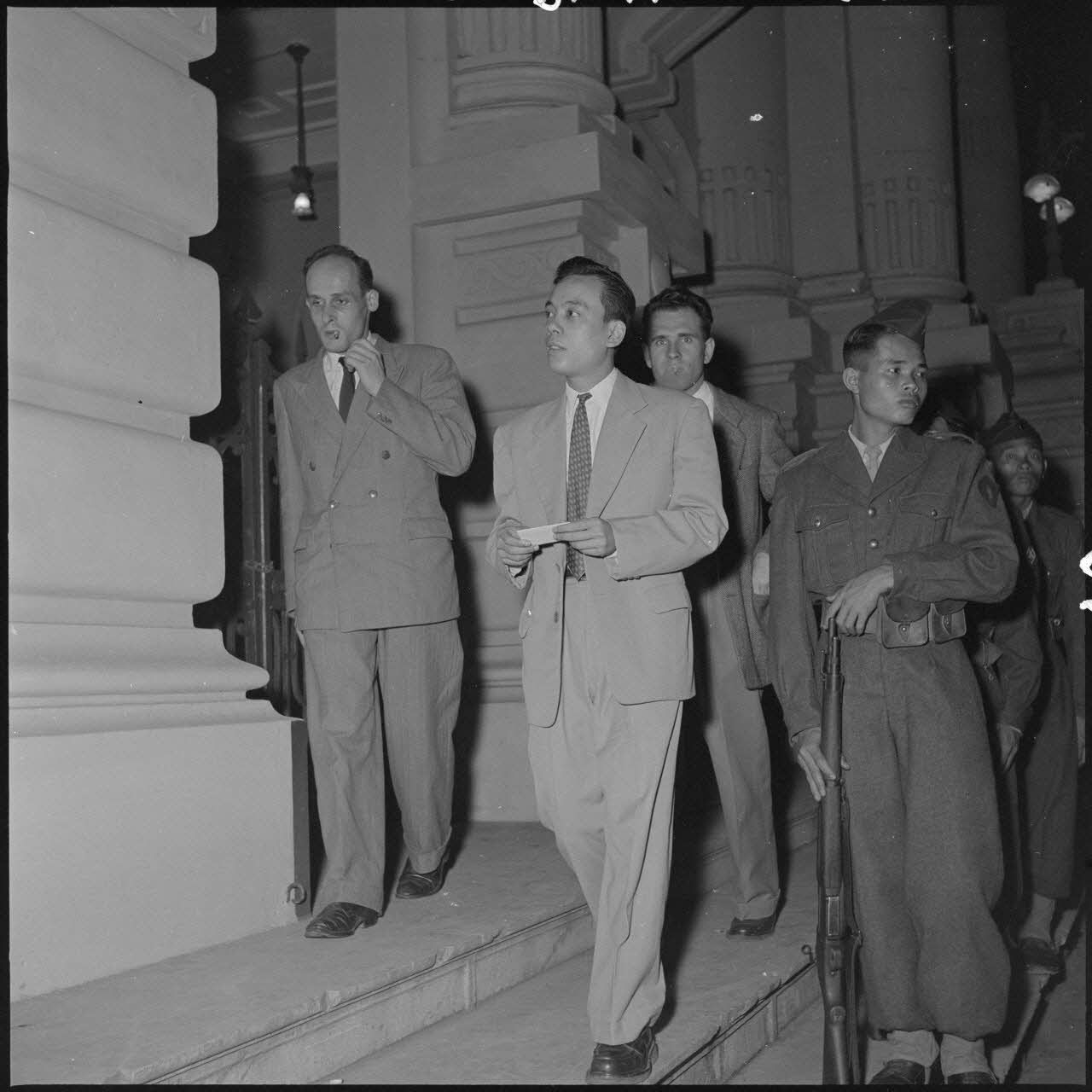 Civils français et soldats vietnamiens devant le théâtre municipal d'Hanoï.