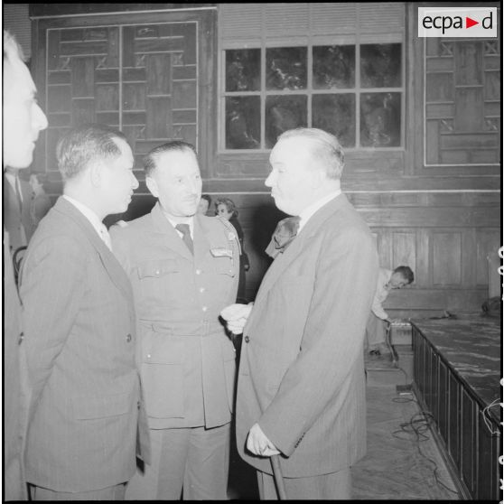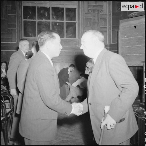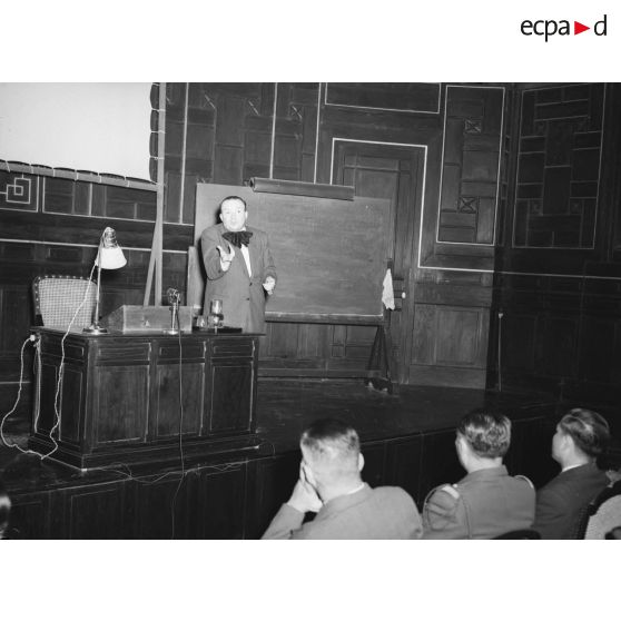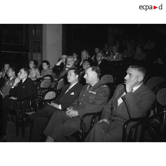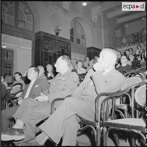 M. Follereau, écrivain et journaliste français, créateur de la journée mondiale contre la lèpre, est venu présenter sa conférence, intitulée "Vingt-cinq ans de charité" à l'université d'Hanoï. Parmi les auditeurs présents : M. Pham van Binh, gouverneur du Nord-Vietnam et le général de Berchoux, adjoint du général de Linarès.