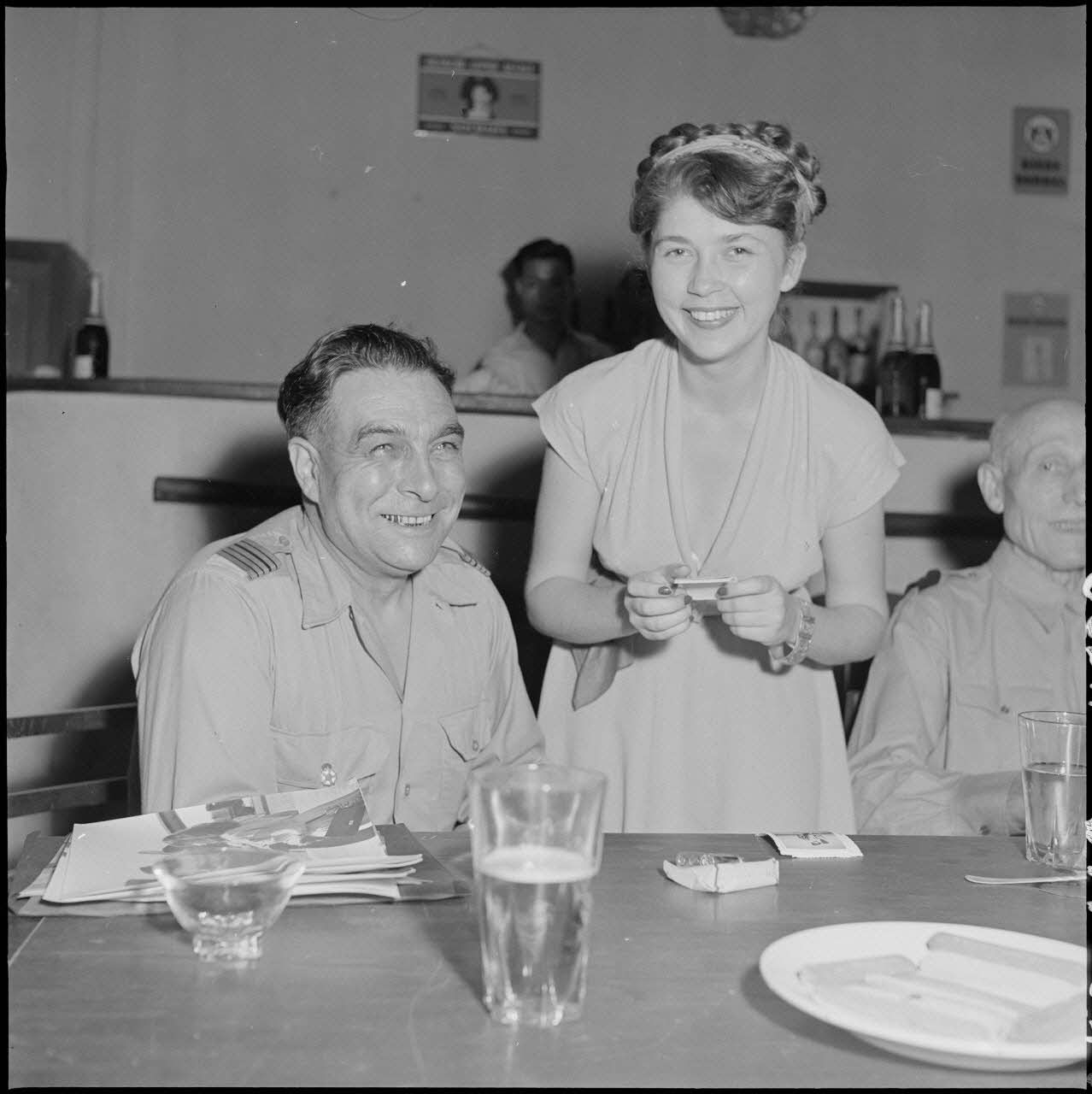 Une jeune femme et un officier au cours d'une réunion des AET (Anciens enfants de troupe) à la maison des combattants.