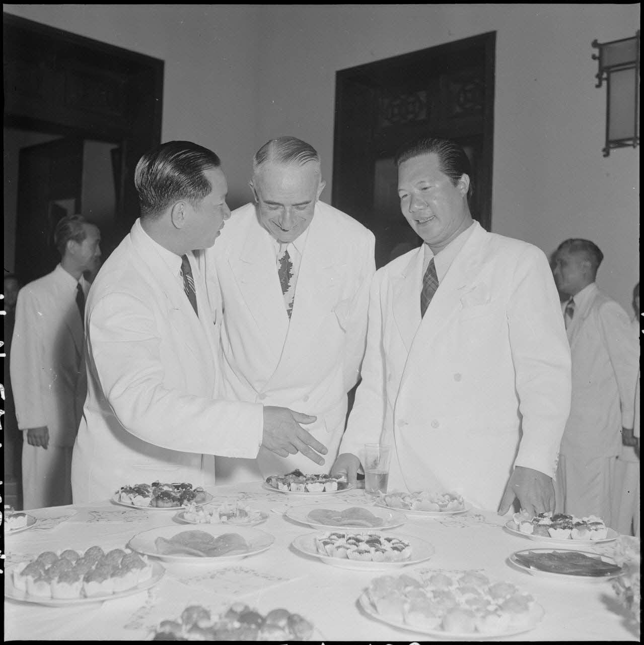 M. Bao Daï, le général de Linarès et M. Pham Van Binh lors d'un cocktail organisé chez le gouverneur du Nord-Vietnam.