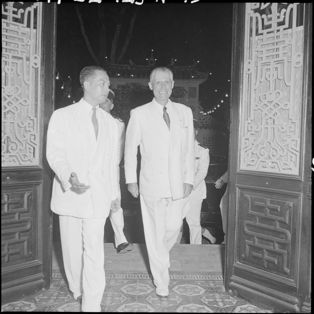 Série de portraits des personnalités invitées au cocktail organisé par M. Pham Van Binh, gouverneur du Nord-Vietnam. On peut voir : Le général de Linarès, général de corps d'armée, commandant en chef des FTNV (forces terrestres du Nord-Vietnam), M. Bao Daï, chef de l'Etat du Vietnam, le général Raoul Salan, général de corps d’armée, commandant en chef en Indochine, et Mgr John Dooley, archevêque de Macra et délégué apostolique en Indochine et en Thaïlande ainsi que Mgr Trinh Nhu Khue, évêque d’Hanoï.