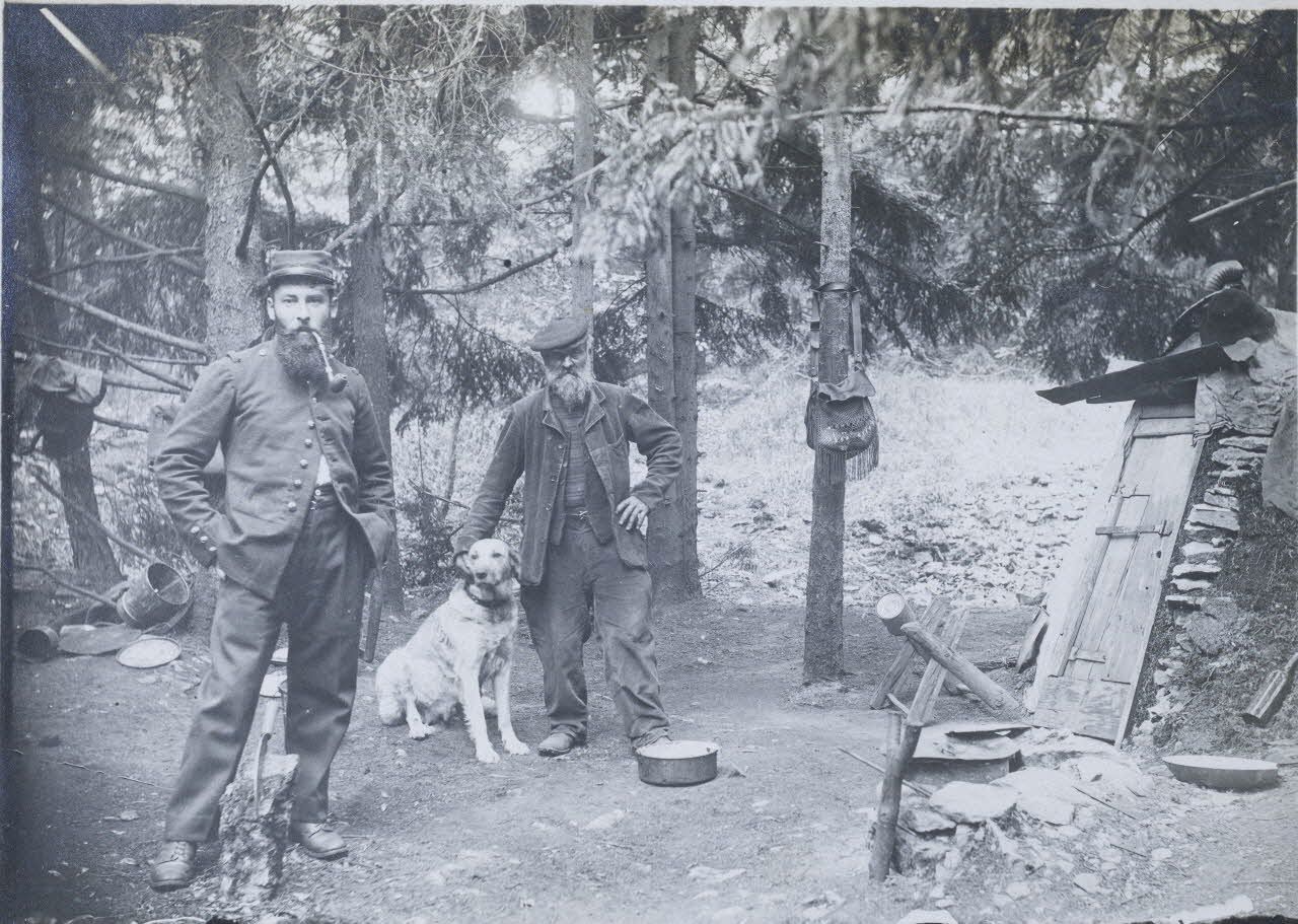 Plateau de Malzeville. Pendant mon service j'allais souvent voir le Père Saintot habitant 1 bois proche - à droite son château - à côté de lui son chien - il s'occupait du jardin militaire et par contre était nourri avec les soldats. 1914. [légende d'origine]