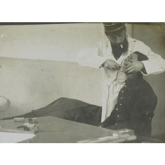 En train d'extirper 1 molaire réfractaire à l'infirmerie du 69e d'Infanterie à Essey les Nancy. Novembre 1913.