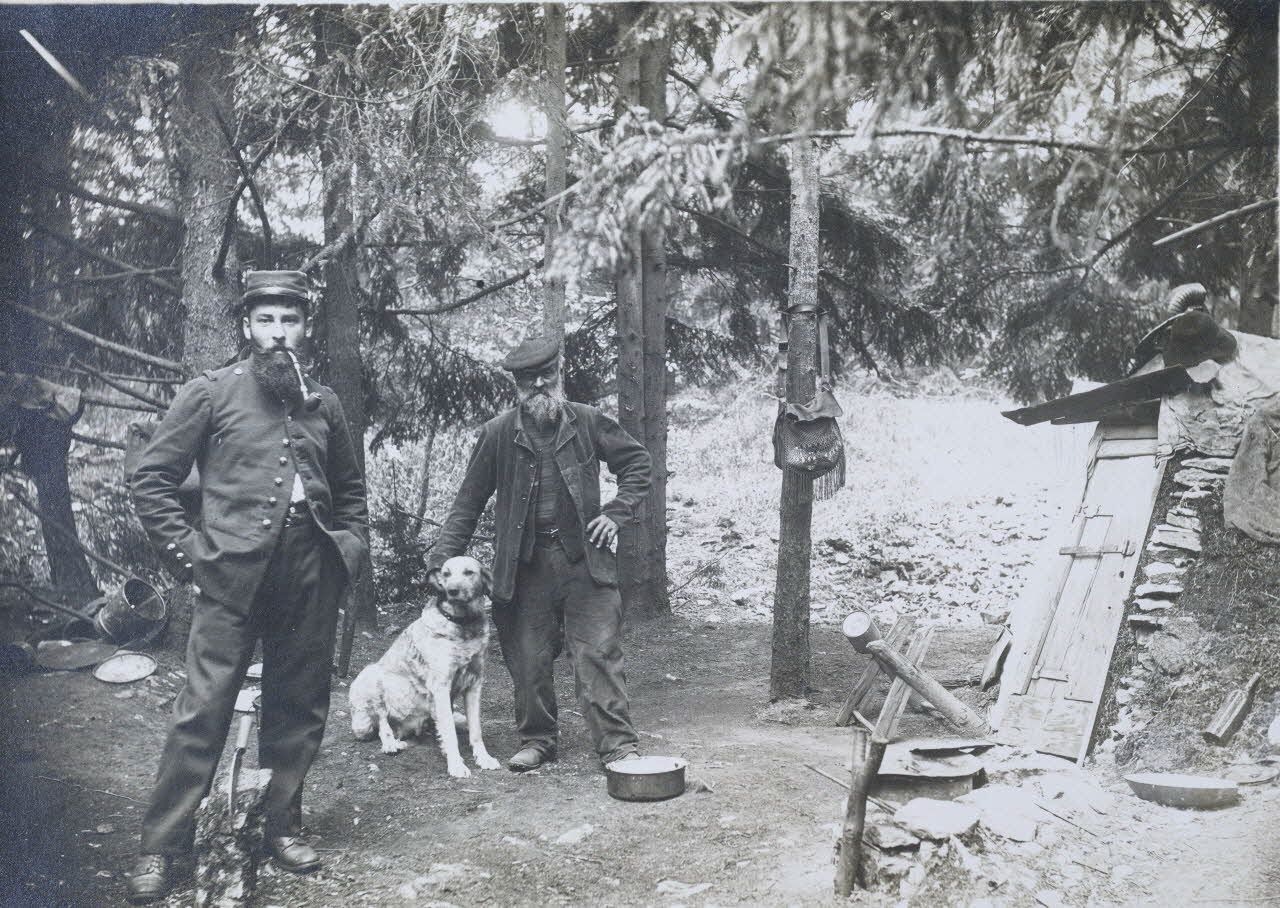 [Plateau de Malzeville. Pendant mon service j'allais souvent voir le Père Saintot habitant 1 bois proche - à droite son château - à côté de lui son chien - il s'occupait du jardin militaire et par contre était nourri avec les soldats. 1914].