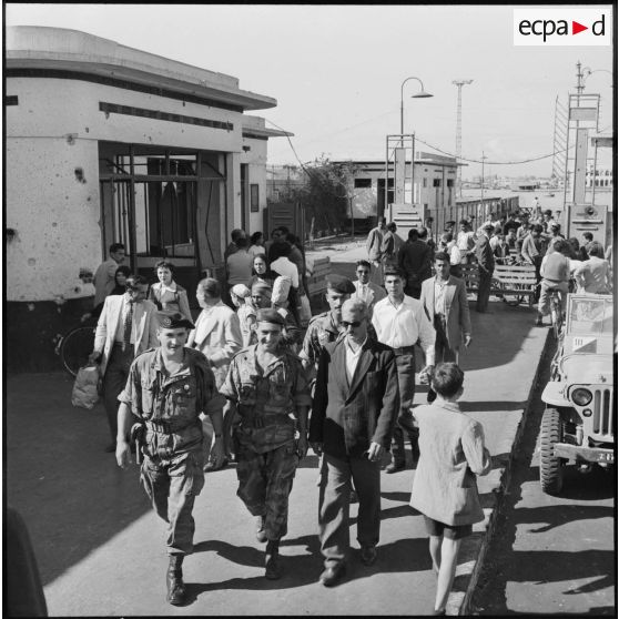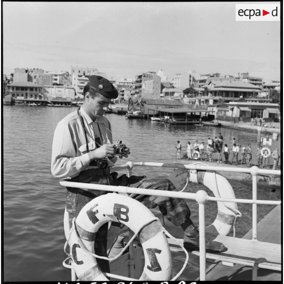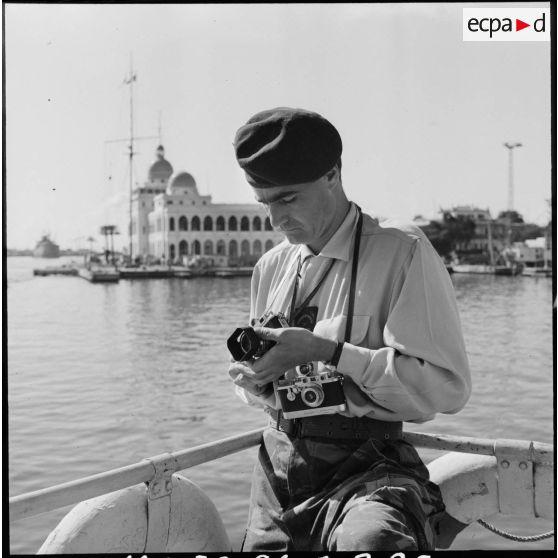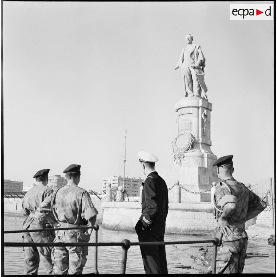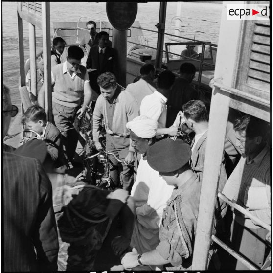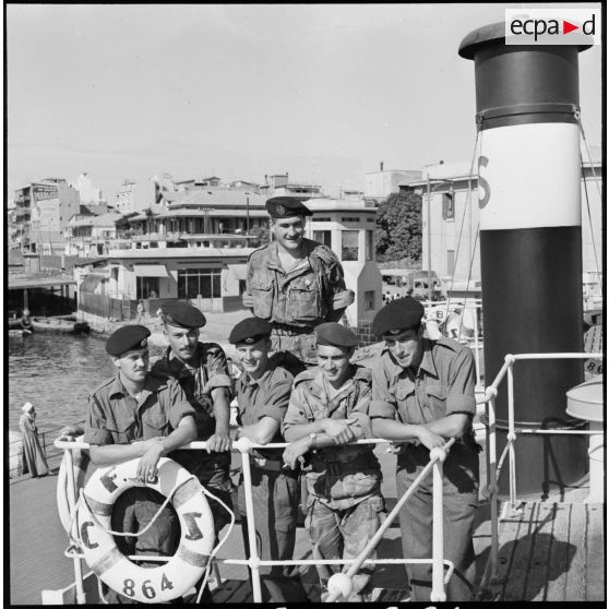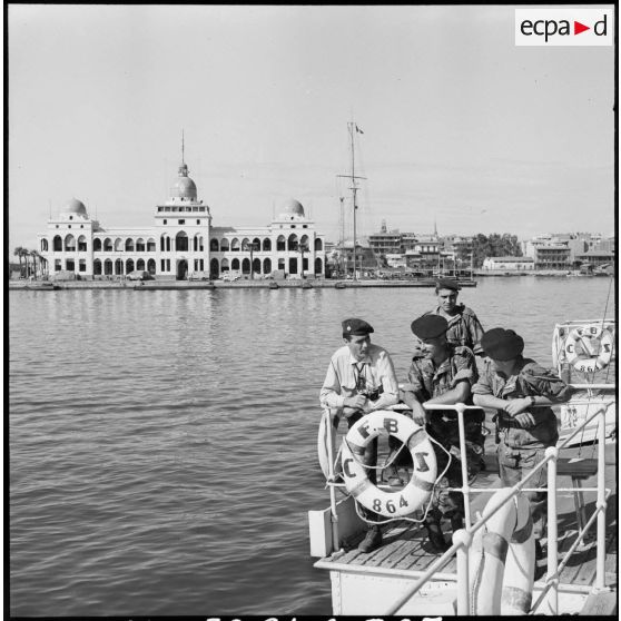 Trois parachutistes français parmi les passagers du ferry assurant la traversée du canal de Suez, à Port-Fouad.