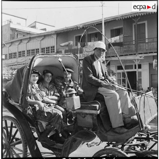 Trois parachutistes français de la 42e compagnie de quartier général dans une calèche à Port-Saïd.