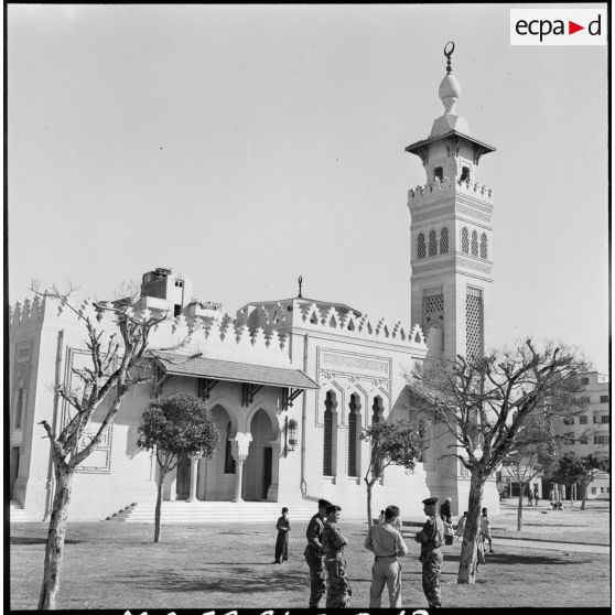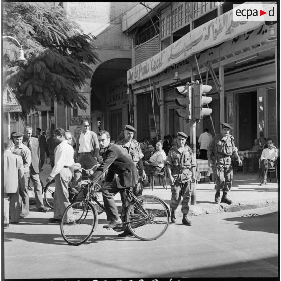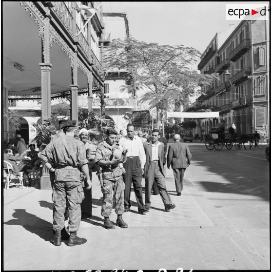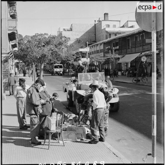 Trois parachutistes français et un photographe ambulant dans une rue de Port-Saïd.