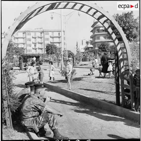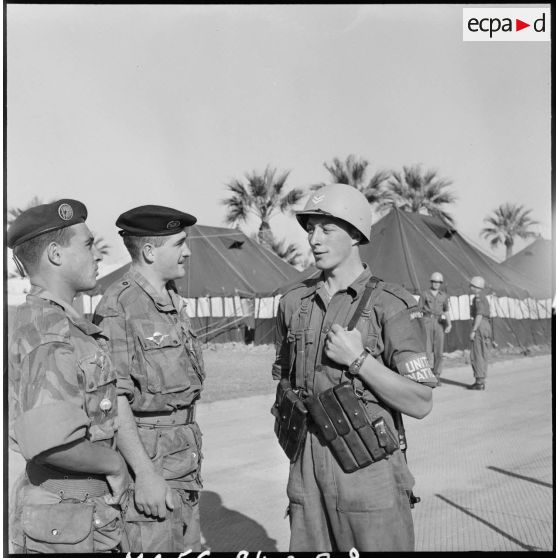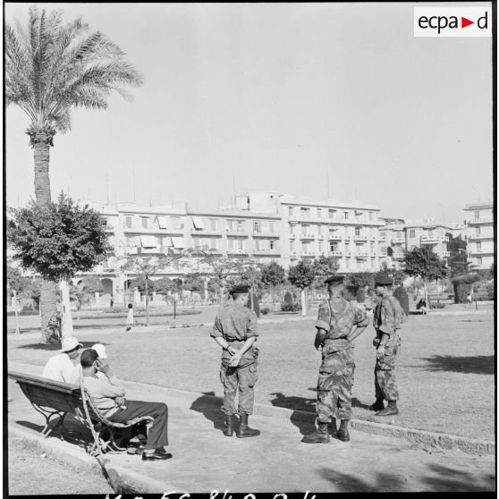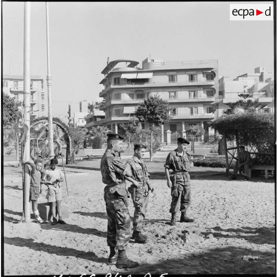 Trois parachutistes français de la 42e compagnie de quartier général dans le jardin Ferial à Port-Saïd.
