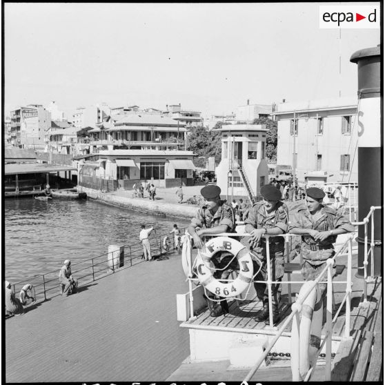 Trois parachutistes français à bord du ferry assurant la traversée du canal de Suez.