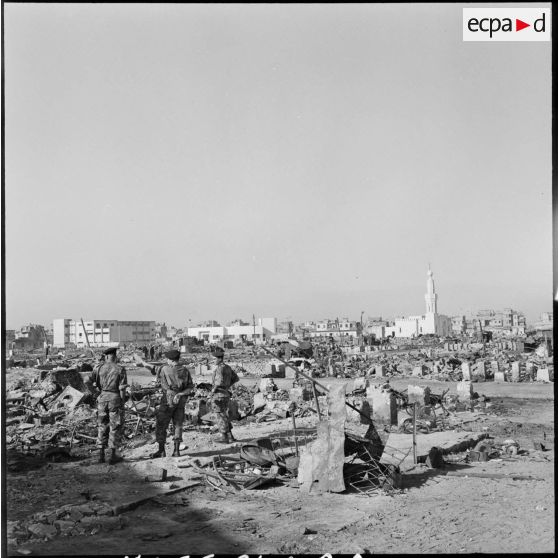 Trois parachutistes français de la 42e compagnie de quartier général dans un bidonville détruit de Port-Saïd.
