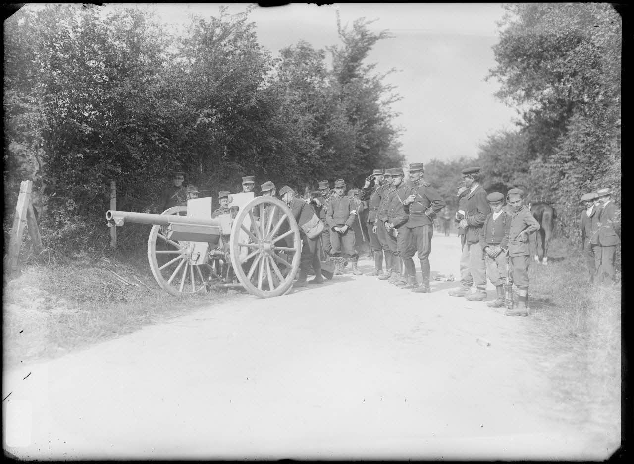 Artillerie - Les servants et les canons relevés dans le champ de manœuvres.