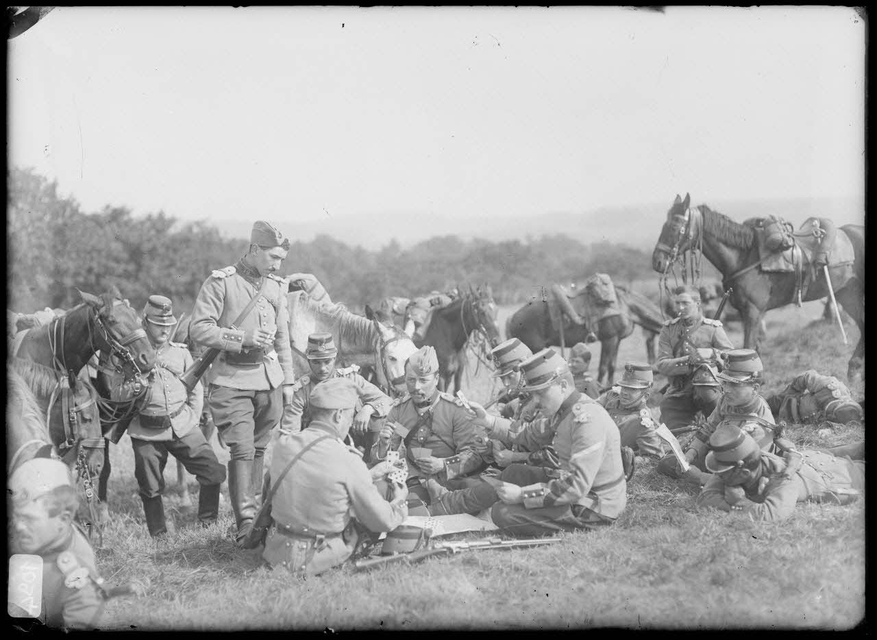 La partie de cartes dans les champs du 19e RCC (régiment de chasseurs à cheval). [légende d'origine]