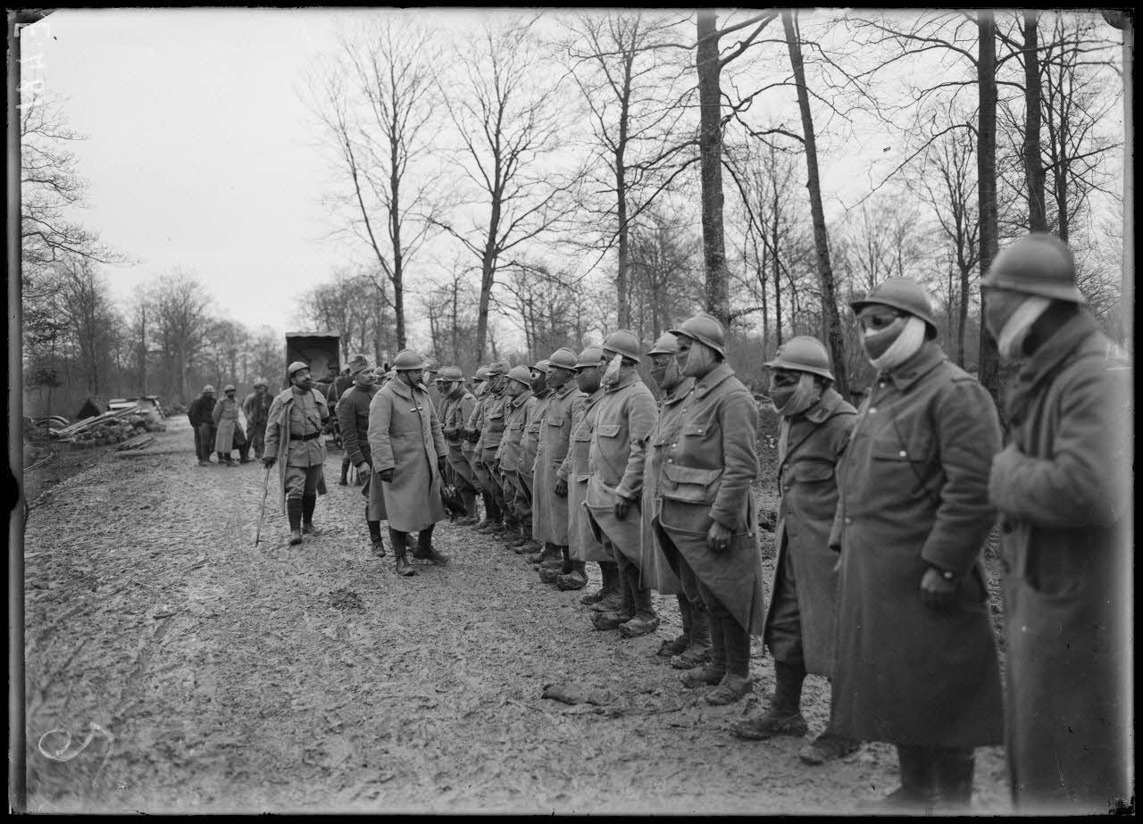 - le capitaine Fournier passe une revue de soldats équipés de masque à gaz, modèle de compresse dit Tampon P2 (plaque de verre SPA E 481) ;