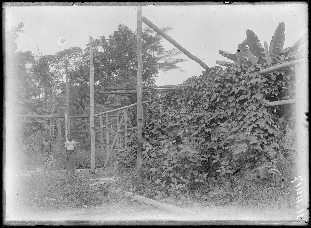 Deux hommes camerounais se tiennent sous la charpente d'une case en construction abandonnée et envahie par la végétation.