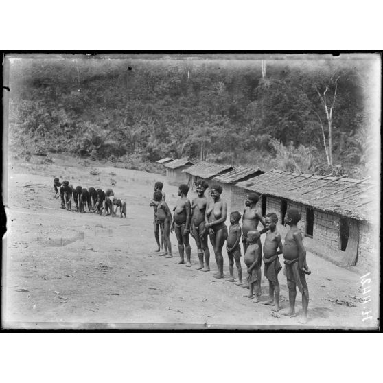 Vue du village de Song Bambé et de ses habitants, marchant devant leurs longues cases rectangulaires en torchis couvertes de palmes.