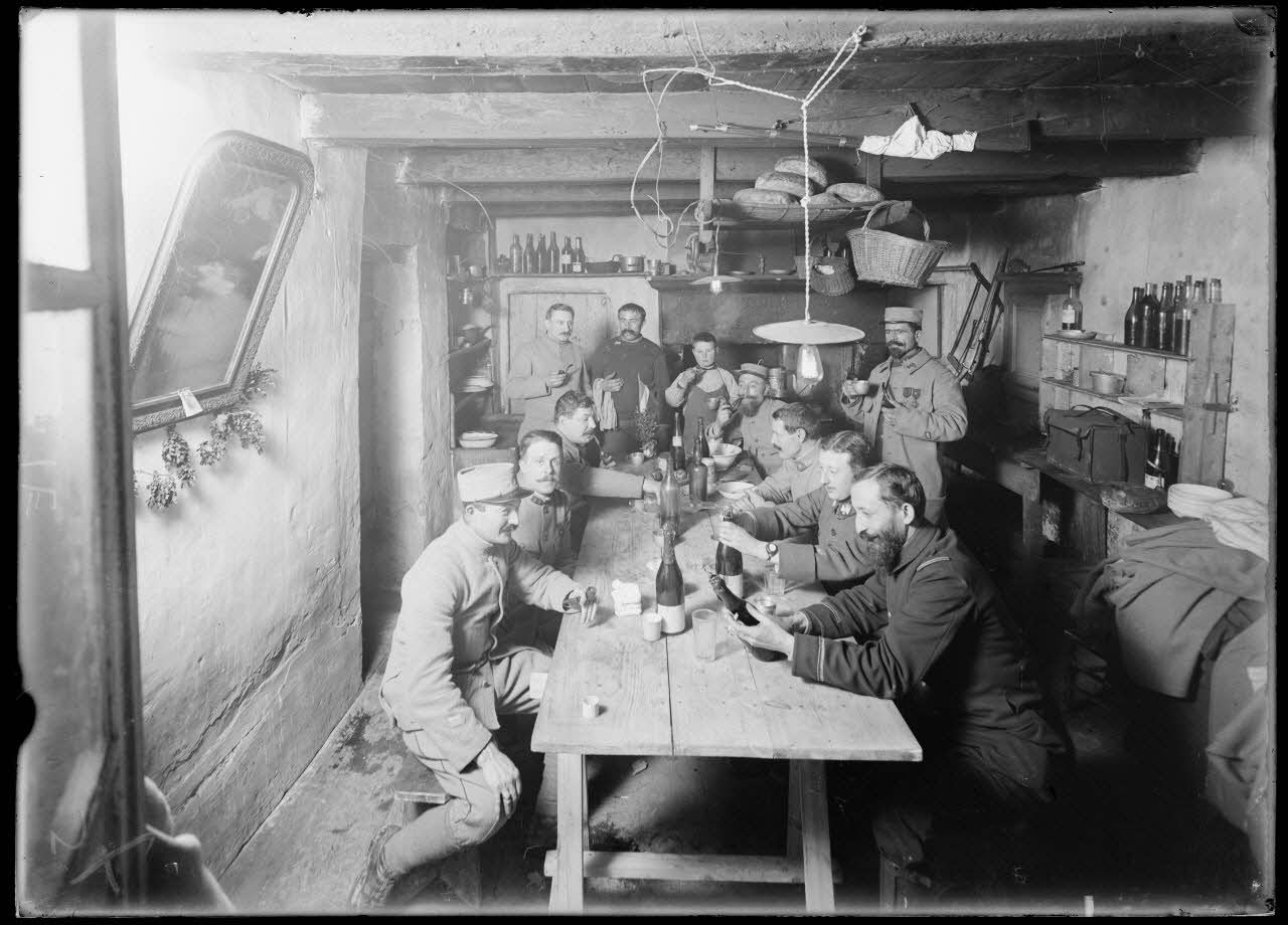 Verdun, la popote des sous-officiers au QG de la RVF. Le 1er janvier 1916 à 21 heures. [légende d'origine]