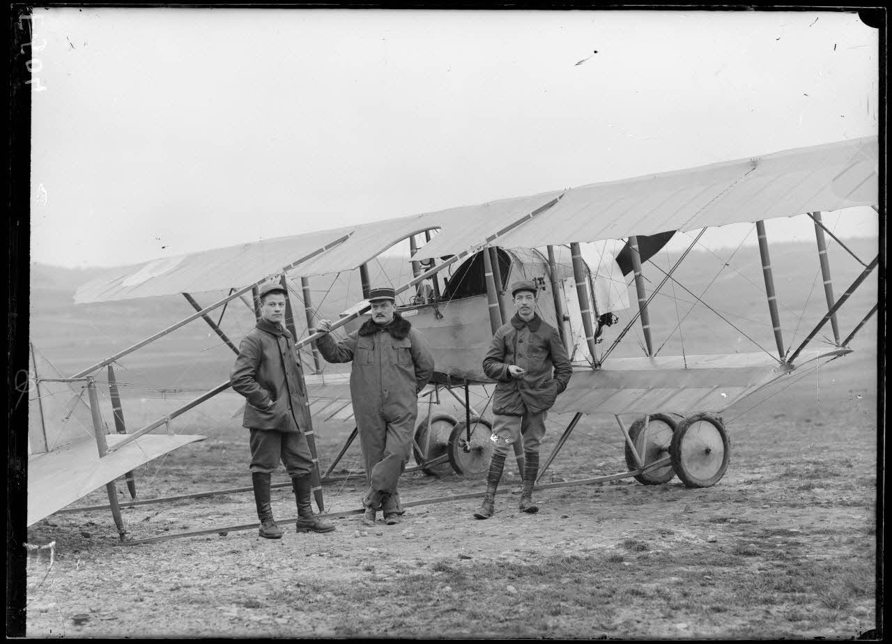 Les avions identifiés en arrière plan sont des Caudron G3 et G4 ainsi qu'un Farman MF11 bis.