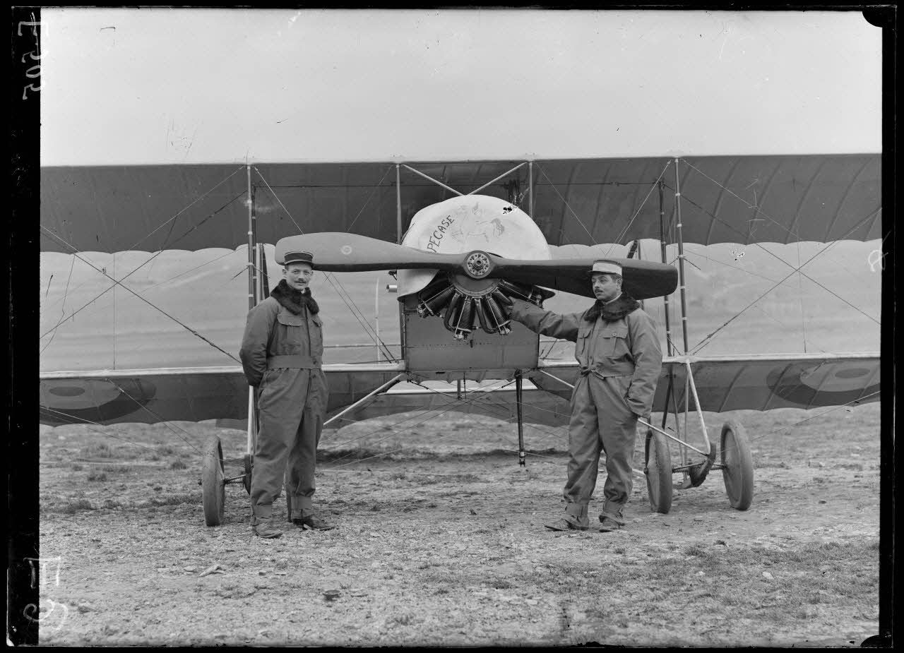 Les avions identifiés en arrière plan sont des Caudron G3 et G4 ainsi qu'un Farman MF11 bis.