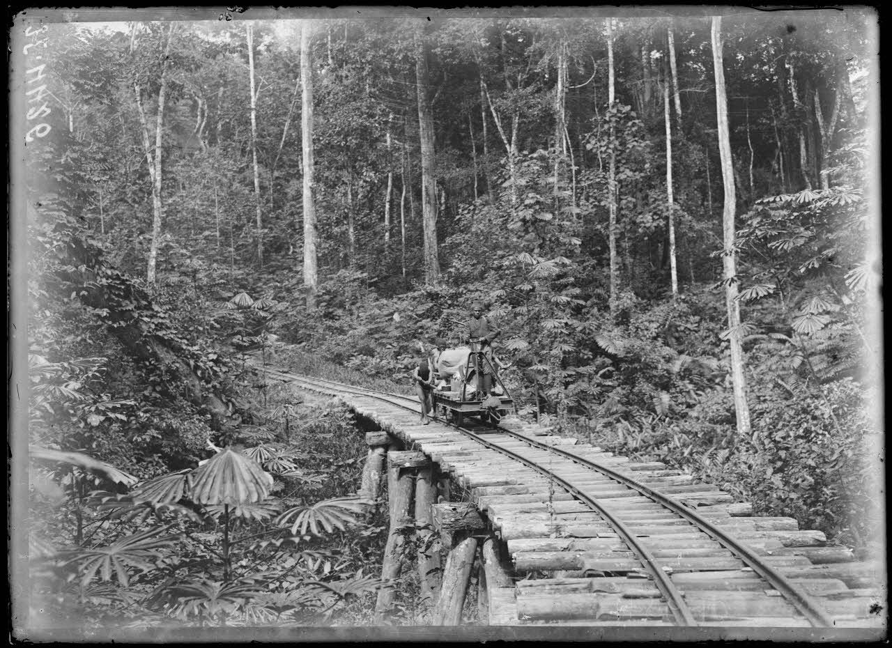 Des hommes poussent un wagonnet sur une voie ferrée franchissant la rivière Moanga sur un pont en rondins. Un tirailleur se tient à l'avant du wagonnet, manoeuvrant le frein.